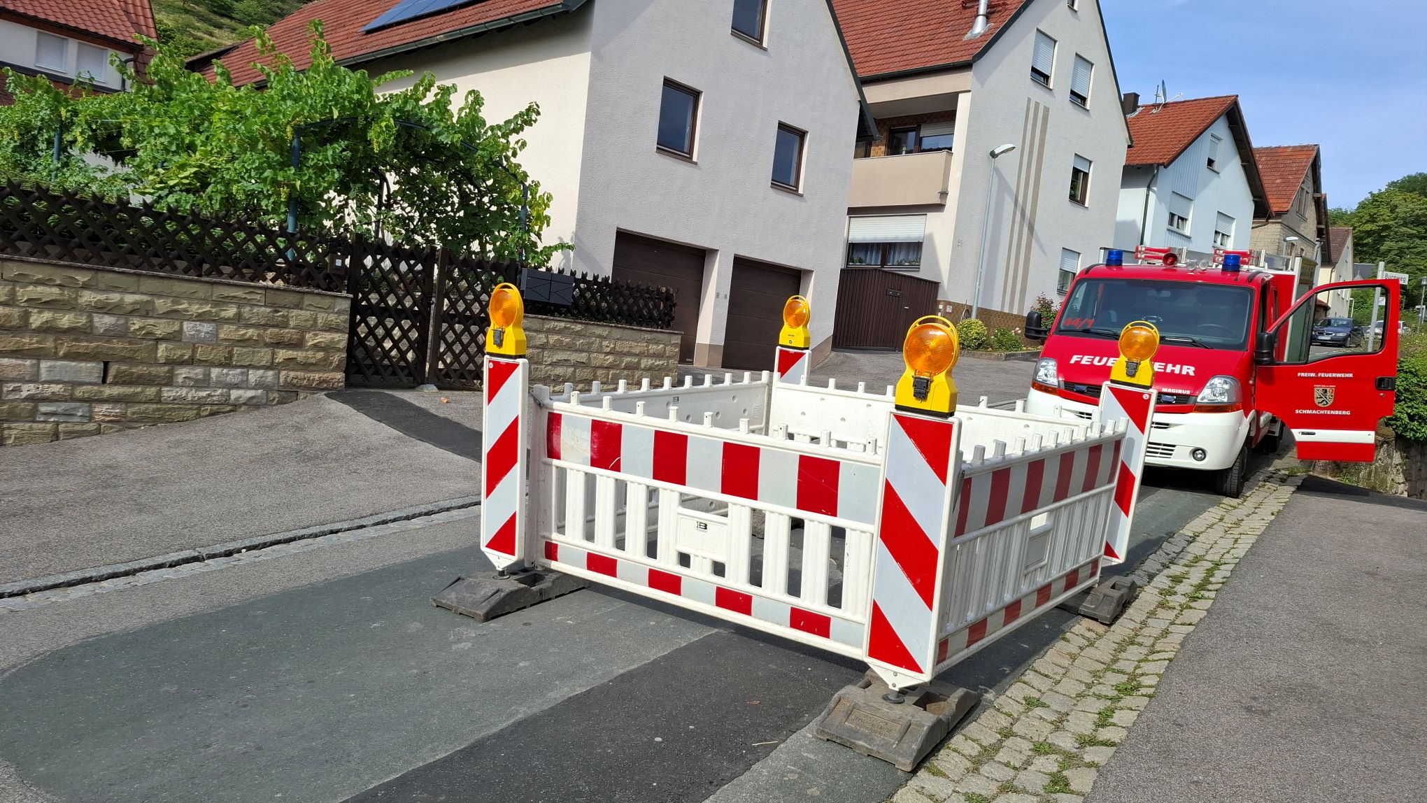 Am Donnerstag, 07.08.2025 verständigte ein besorgter Anwohner die Feuerwehr Schmachtenberg, weil sich die Straße abgesenkt hatte und bereits ein Loch im Asphalt entstanden war.